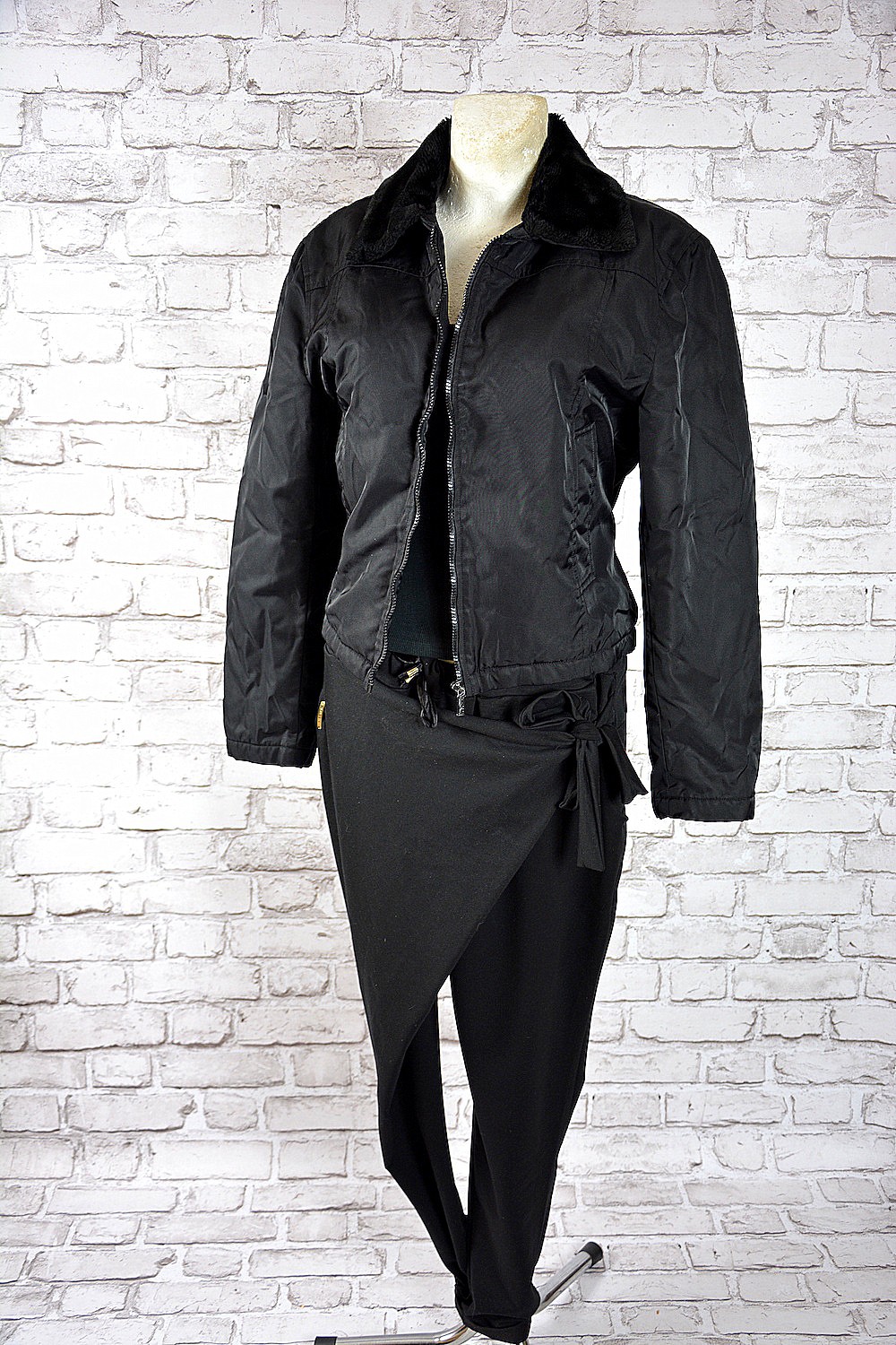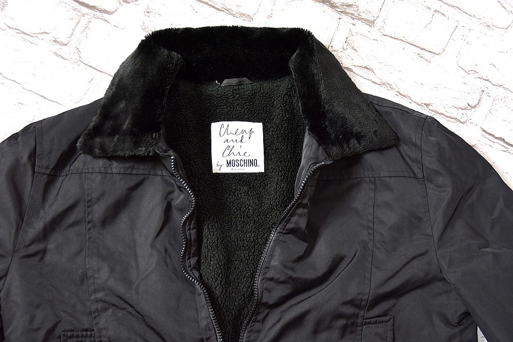 Czarna kurtka od Moschino z kolekcji Cheap and Chic, kurtka od wewnątrz na kożuszku, rękawy ocieplane watą, zasuwana na suwak, po bokach kieszenie, kołnierz ze sztucznego futerka,przy rękawach suwaki.