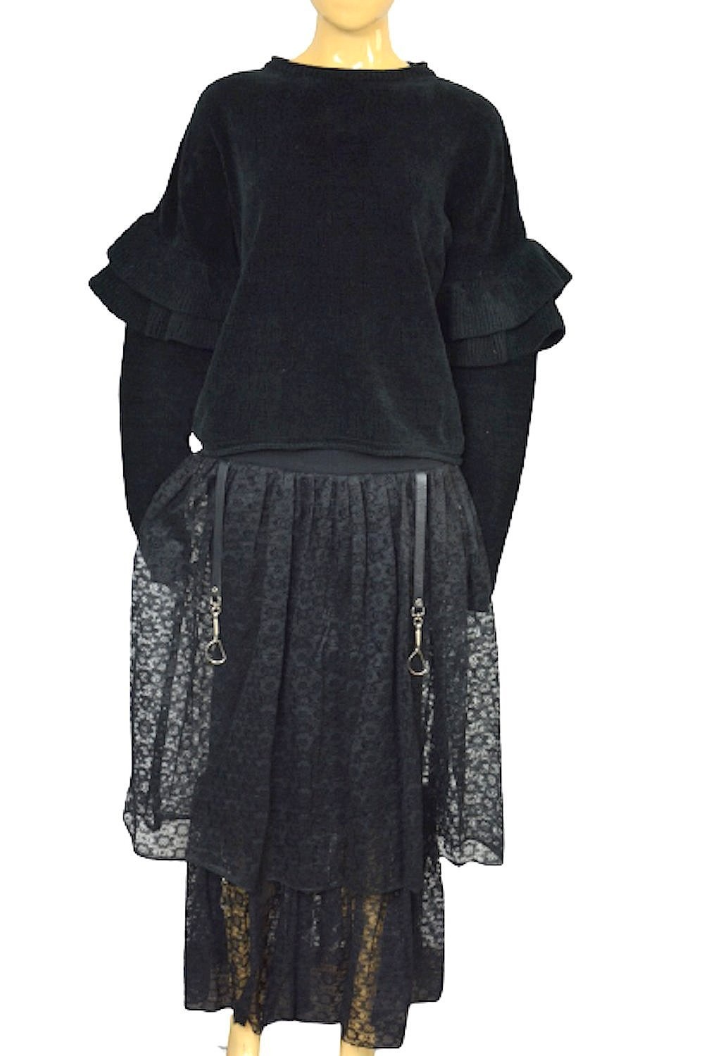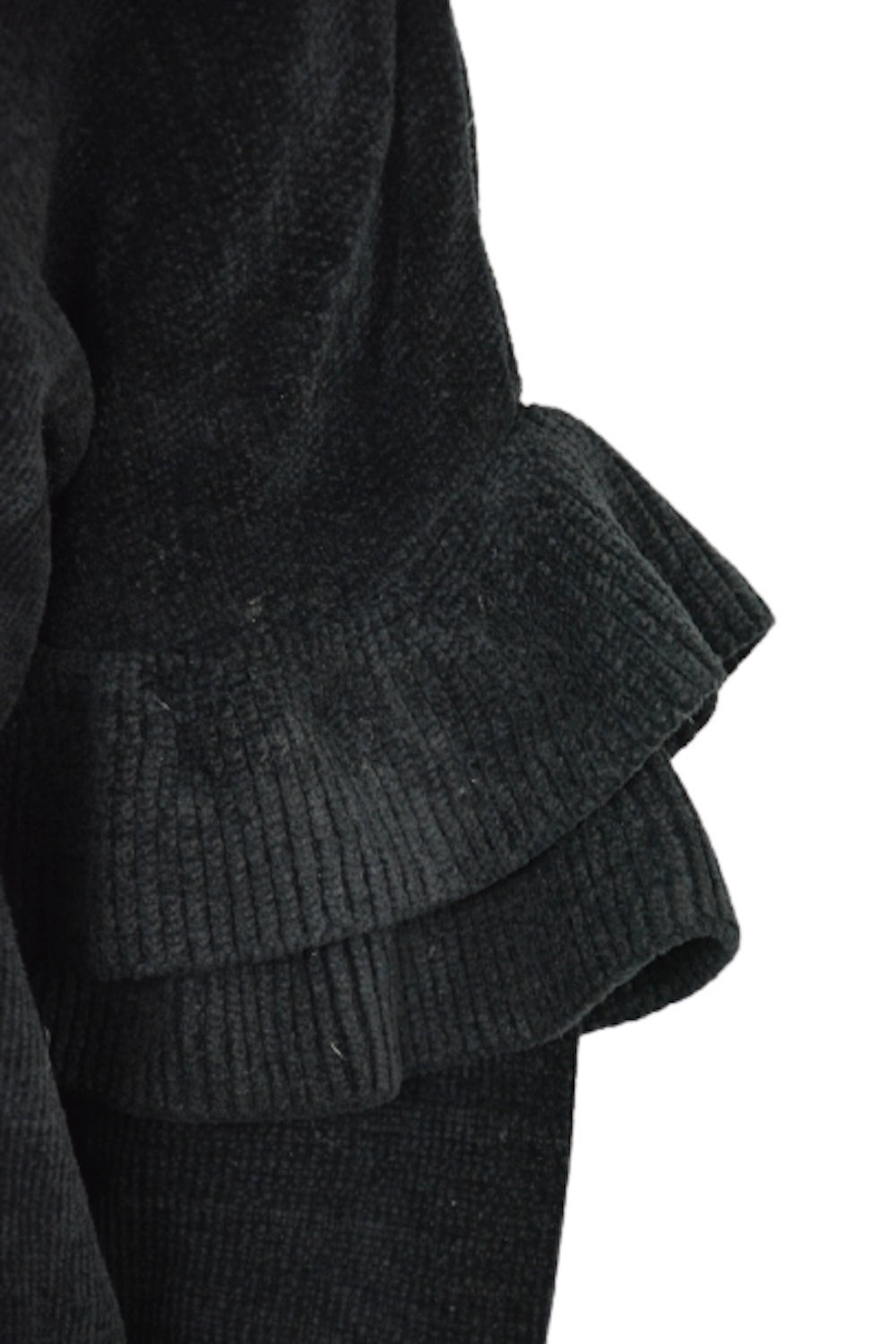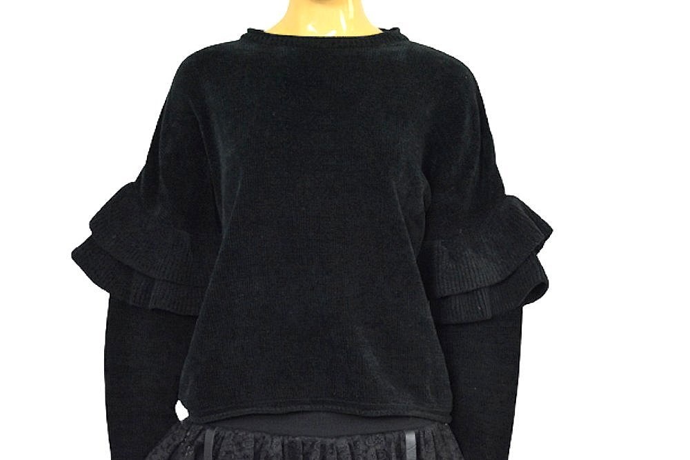 Ciepły, czarny szenilowy sweter z kolekcji Zary z nadającymi uroku falbankami na rękawach
