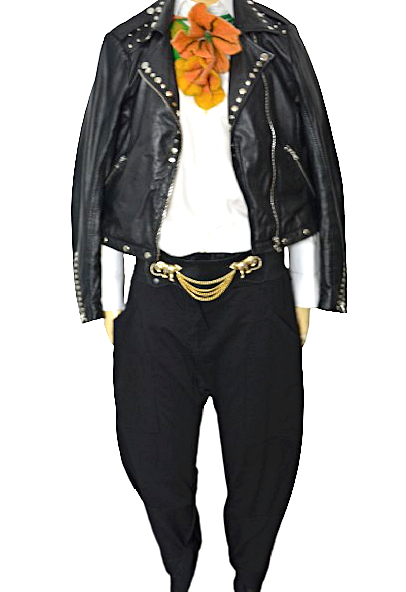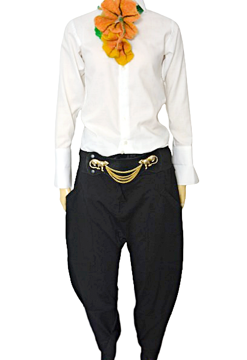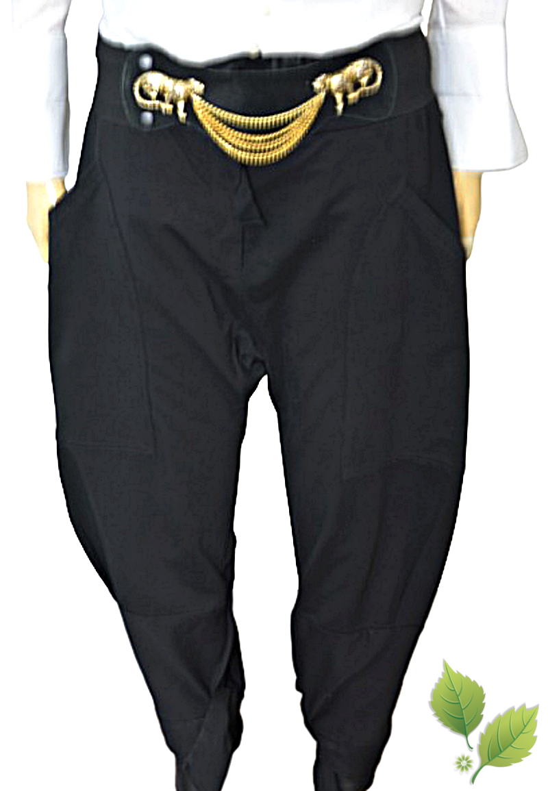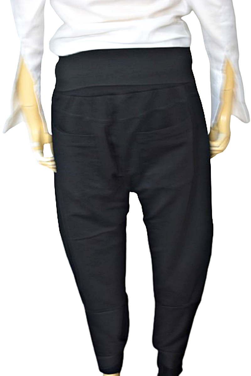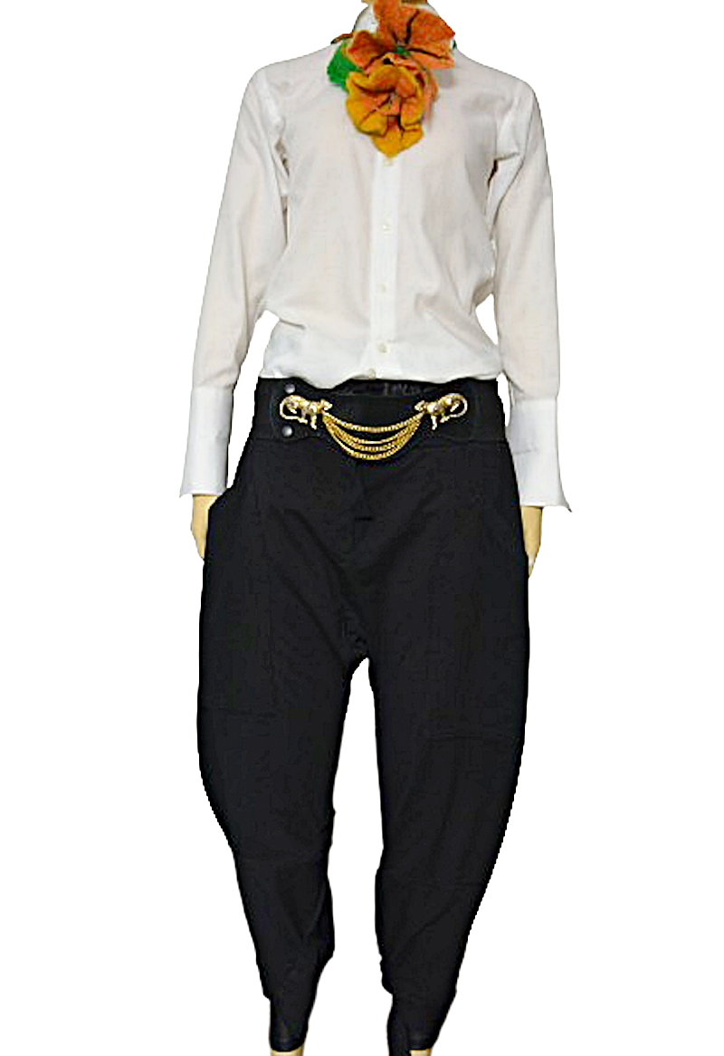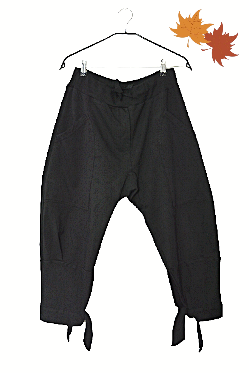 nogawki w udach luźne, stopniowo lekko zwężane ku dołowi, wykończone paseczkami do przewiązania