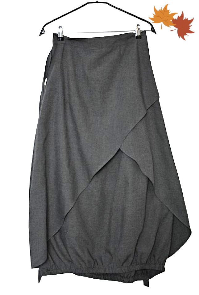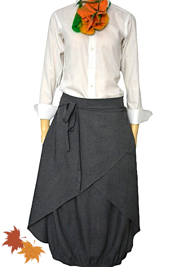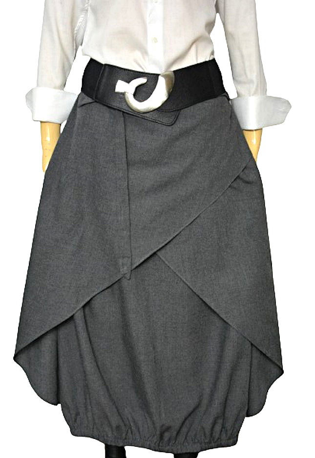 O bardzo oryginalnym i ciekawym kroju włoska długa szara spódnica z idącymi od frontu zakładkami